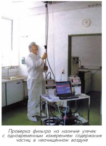 Проверка установленных воздушных фильтров на наличие утечки представляет собой метод обнаружения возможных небольших дефектов или других повреждений в фильтрующей среде и месте ее герметизации, а также в уплотнениях корпуса фильтра или в системе крепления фильтра. Проверка фильтра на наличие утечек проводится следующим образом: на входе фильтра (т.е. со стороны неочищенного воздуха) распыляется тестовый аэрозоль, а на чистой стороне непосредственно рядом с поверхностью фильтра и его системой крепления с помощью прибора для измерения содержания частиц сканируют всю контролируемую поверхность или же после фильтра проводятся измерения интегрального воздушного потока со всей поверхности фильтра. Проведение проверки на наличие утечки является составной частью аттестации всех чистых помещений.