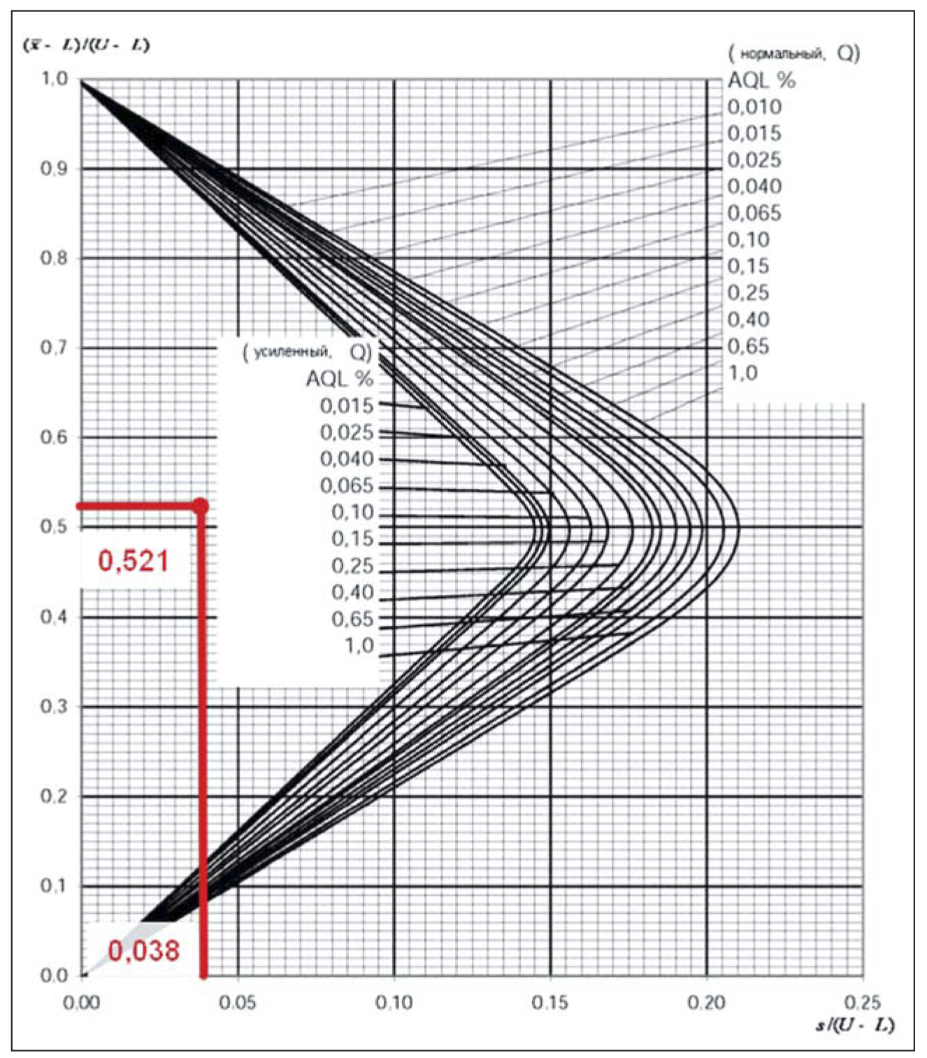 Капсульная машина – другой подобный пример, основное отличие которого заключается только в том, что результаты варьирования параметрами можно оценить ещё и количественно – по однородности массы содержимого капсул. Любая технологическая инструкция и любой протокол производства предоставляют своеобразные «ворота», где регламентированы минимальная и максимальная массы содержимого капсул. На рис. 1 представлен пример полученного результата в случае, когда мы задаёмся двумя границами поля допуска и рассчитываем координаты контрольной точки, исходя из статистических данных (главным образом, выборочного стандартного отклонения, сравнивая его действительное расчетное значение с максимально допустимым на основании объёма выборки и заданного AQL). Если расчётное значение выборочного стандартного отклонения меньше максимально допустимого, нужно рассчитать координаты характеризующей ту или иную серию точки, и эта точка должна находиться с внутренней стороны определённой приёмочной кривой. Подробнее об этом можно узнать в п. 16.4 [7].