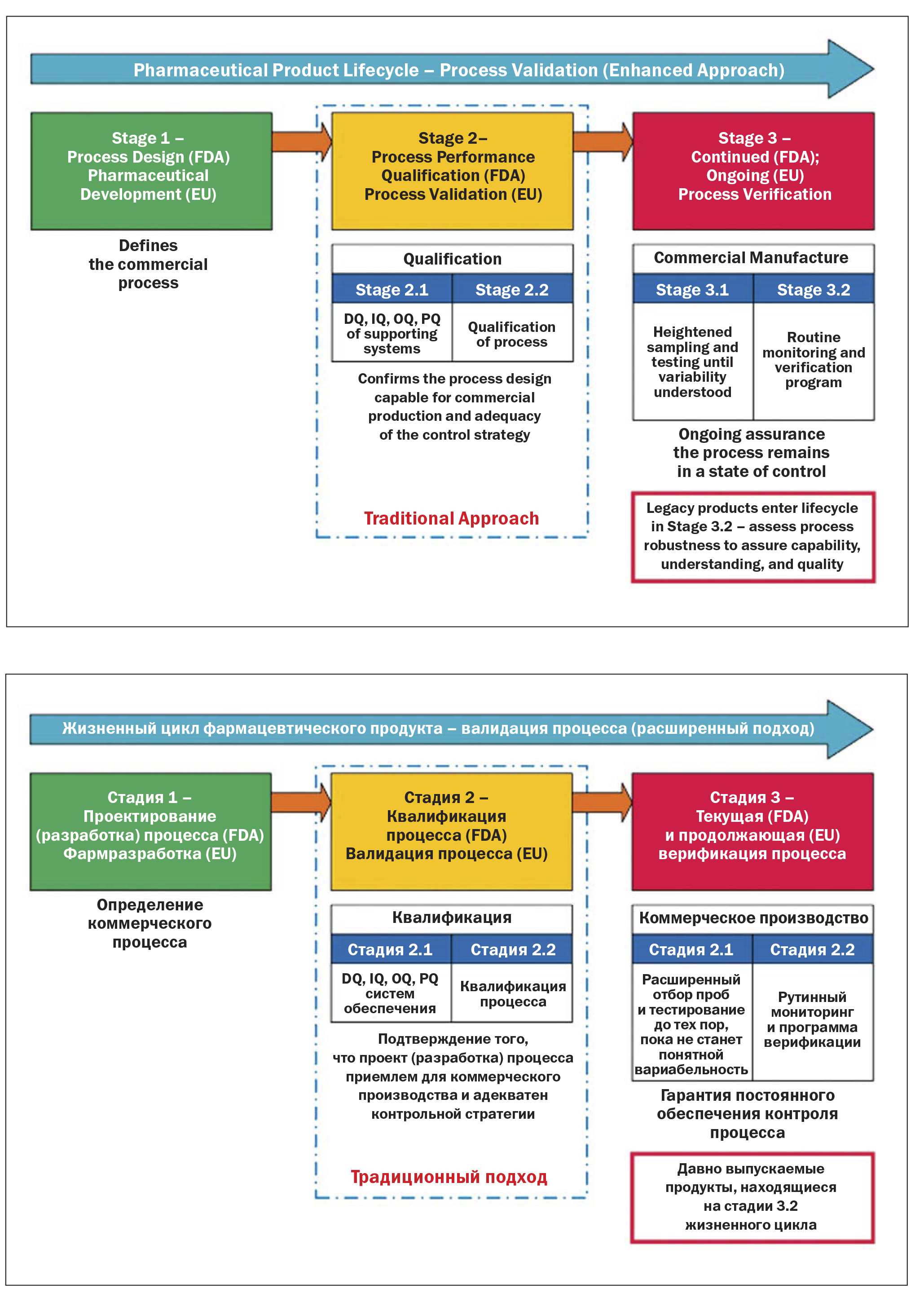 Ценным в руководстве ISPE является то, что в нём подытожен опыт нескольких руководств EMA по валидации процесса [1], а также показаны в сравнении американский и европейский подходы, их не только терминологические особенности, но и ряд сущностных различий. На рис. 2 на эти различия указано в скобках (FDA или EU).