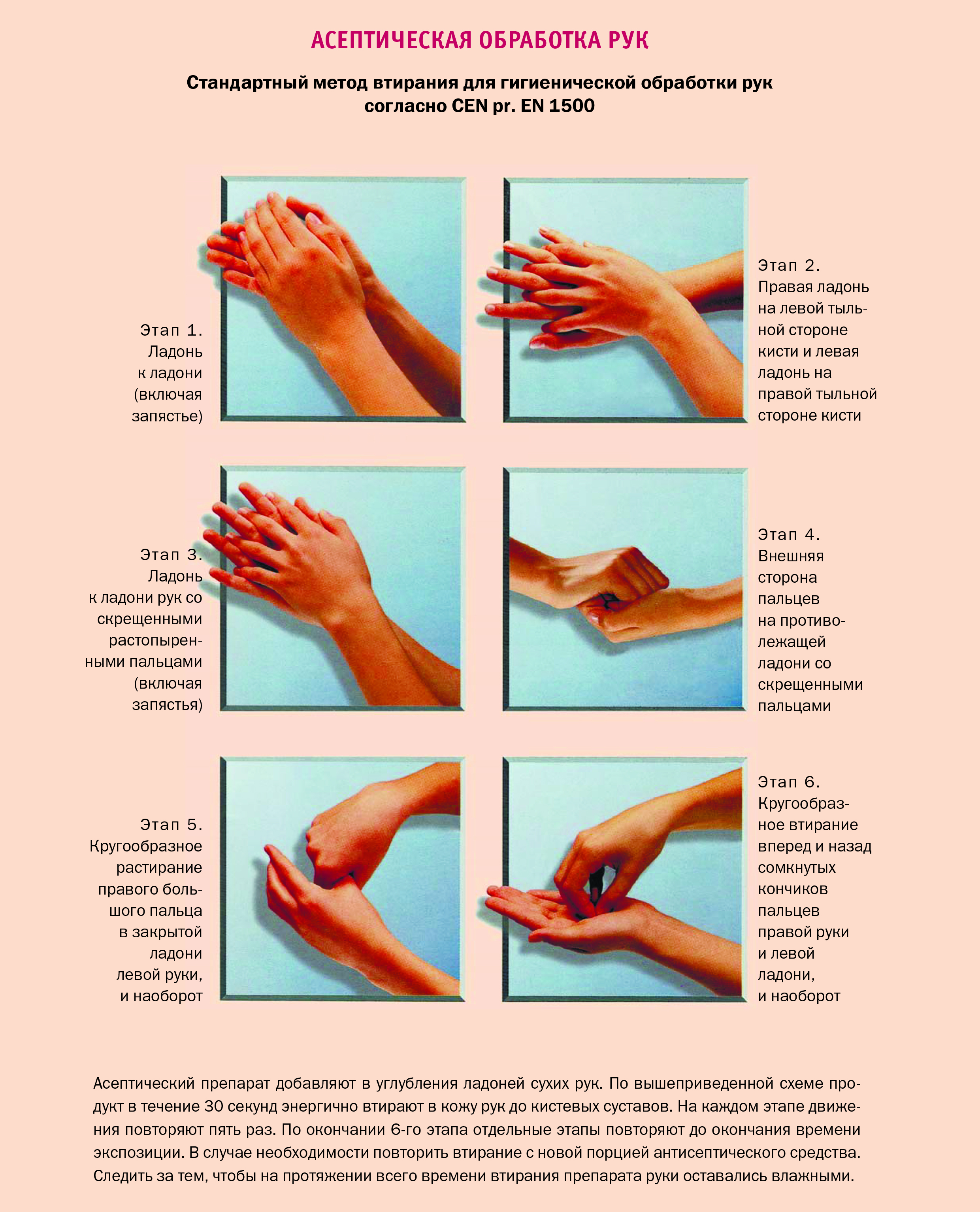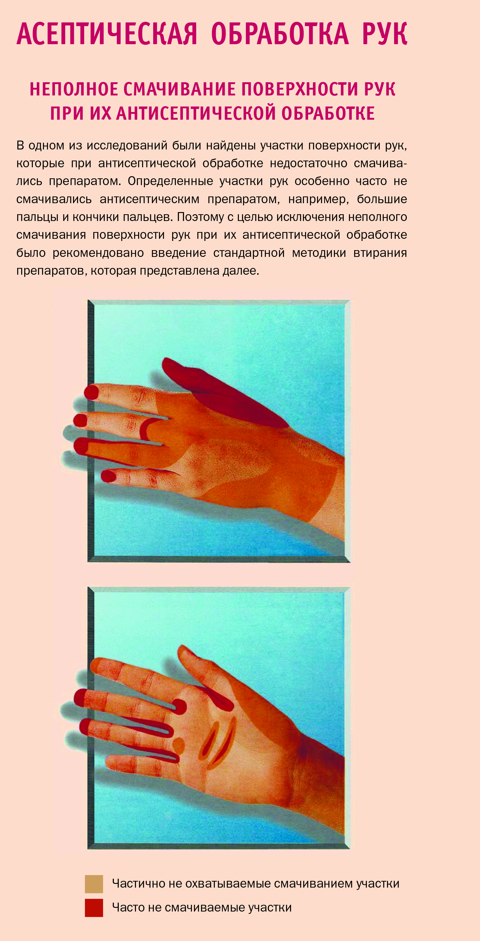 В одном из исследований были найдены участки поверхности рук, которые при антисептической обработке недостаточно смачивались препаратом. Определенные участки рук особенно часто не смачивалисьантисептическим препаратом, например, большие пальцы и кончики пальцев. Поэтому с целью исключения неполного смачивания поверхности рук при их антисептической обработке было рекомендовано введение стандартной методики втирания препаратов, которая представлена далее.