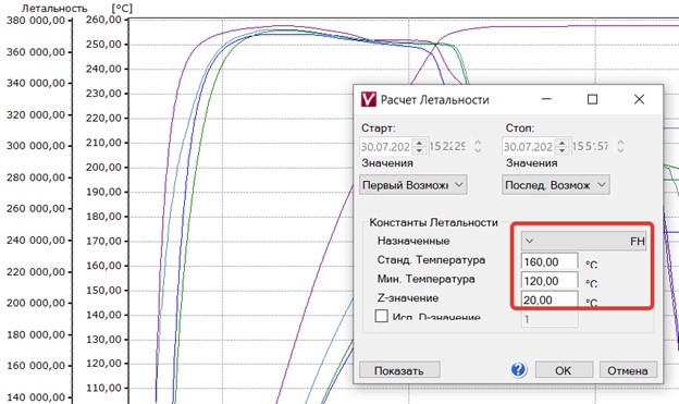 В целом при расчете (аналогичном расчету эквивалентного времени летальности) для случая стерилизации влажным (F0) и сухим (Fh) жаром отличаются только величины базовых температур и величины z. Так, для расчета величины эквивалентного времени летальности для случая стерилизации сухим жаром Fh в техническом отчете PDA TR No. 3 используется базовая температура 160 ℃ и величина z = 20 ℃ (рис. 1).
