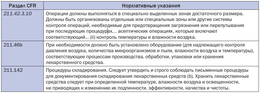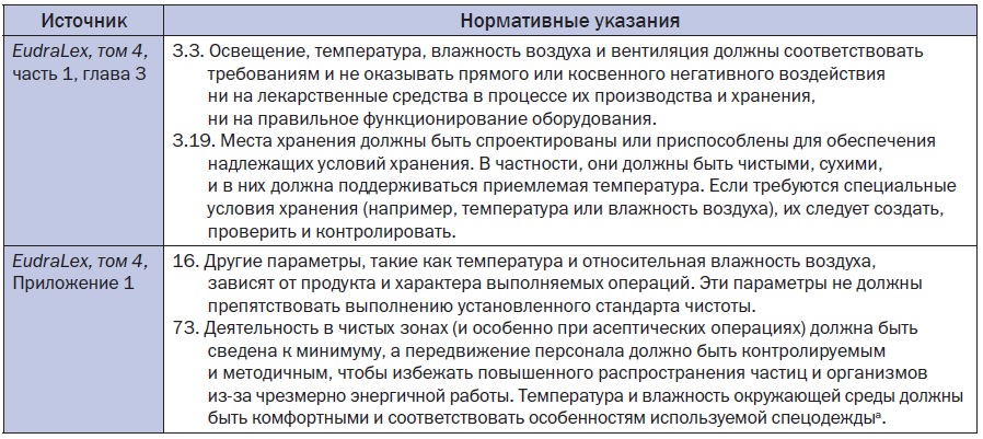 Температура и влажность воздуха считаются важнейшими факторами при проектировании и эксплуатации надлежащих производственных объектов, соответствующих требованиям. Несмотря на это, нормативные документы по этим вопросам на удивление нечеткие. В целом правила предполагают, что в производственных зонах температура и влажность должны быть соответствующими, при этом основное внимание должно уделяться зонам длительного хранения, хотя и считается, что эти требования в значительной степени зависят от конкретного продукта. В табл. 1 и 2 представлены основные нормативные указания ЕС и США из EudraLex [1, 2] и Свода федеральных нормативных актов США (US Code of Federal Regulations - CFR) [3], соответственно.