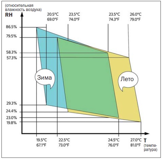 Рисунок 1. Сезонные условия комфорта (температура и относительная влажность воздуха)