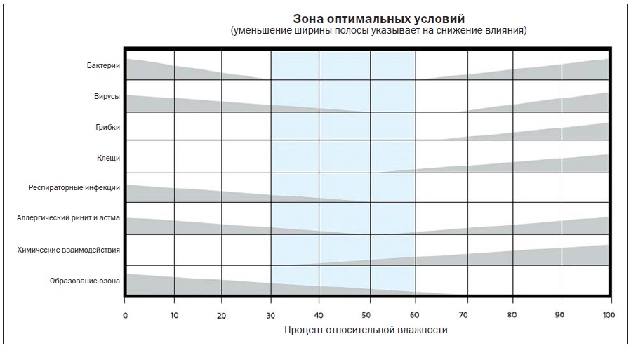 В помещениях с относительной влажностью воздуха менее 60 % рост микроорганизмов и прорастание спор весьма маловероятны (рис. 3). На рисунке 4 представлена взаимосвязь условий окружающей среды и комфортных условий [9].