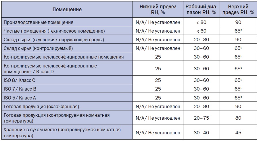 aБолее широкие рабочие диапазоны с повышенными верхними пределами были успешно использованы при соответствующей квалификации и мониторинге влияния относительной влажности воздуха на местный рост микробов. Для своевременного уведомления о возможной проблеме сигналы тревоги должны быть установлены для значений, близких к пределам рабочих диапазонов. Представленные в таблице пределы рекомендуются в качестве начальных параметров на время сбора эксплуатационных данных.