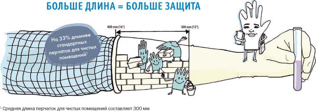 Длина стандартных перчаток для чистых помещений составляет 300 мм, однако при работе с опасными материалами, такими как препараты для химиотерапии, следует использовать перчатки длиной 400 мм, закрывающие руку до локтя и защищающие от воздействия вредных веществ.