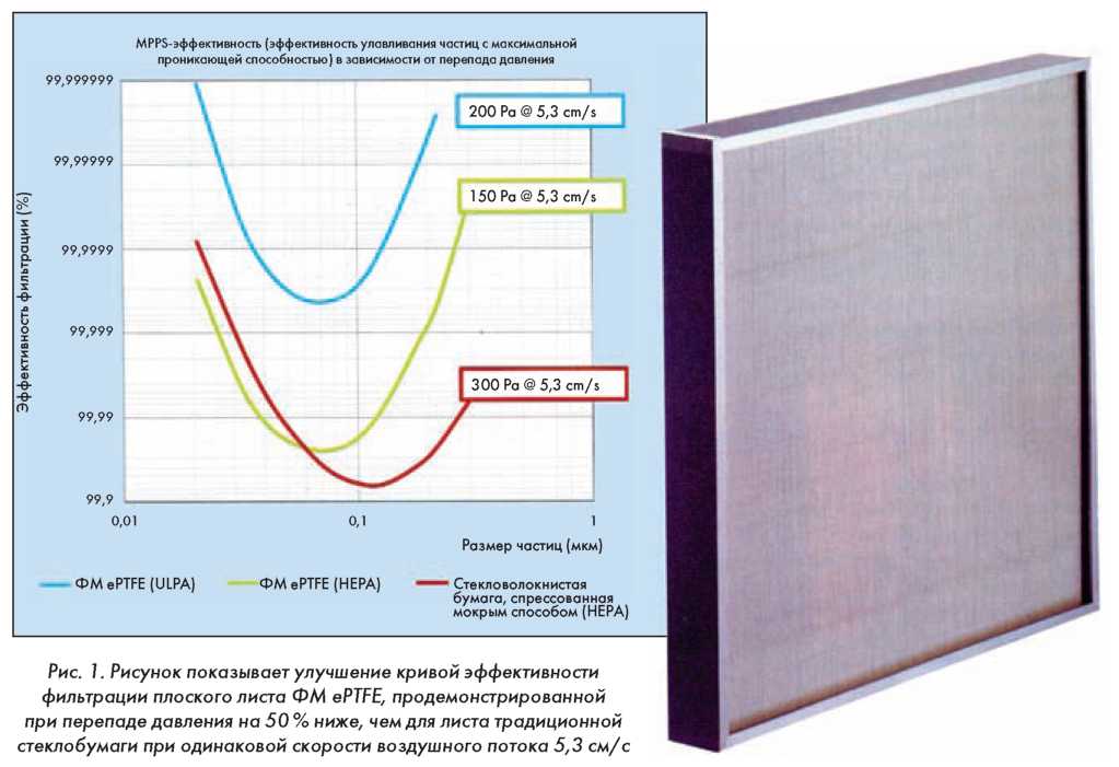 Сравнительные исследования НЕРА-фильтров класса Н14 по EN1822-1:2009 показывают, что фильтровальный материал на основе волокон ePTFE (далее по тексту ФМ ePTFE) позволяет снизить сопротивление фильтра до 50 % по сравнению со стеклобумагой. Кроме того, эффективность фильтрации воздуха повышается, т.к. наиболее проникаемые частицы имеют размер от 0,06 мкм до 0,08 мкм против 0,1–0,25 мкм у стеклобумаги.